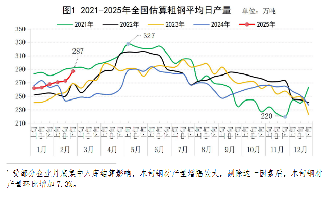 2025年2月下旬,重點(diǎn)統(tǒng)計(jì)鋼鐵企業(yè)共生產(chǎn)粗鋼1807萬(wàn)噸,平均日產(chǎn)225.9萬(wàn)噸,日產(chǎn)環(huán)比增長(zhǎng)5.0%;生鐵1589萬(wàn)噸,平均日產(chǎn)198.6萬(wàn)噸,日產(chǎn)環(huán)比增長(zhǎng)4.1%;鋼材1841萬(wàn)噸,平均日產(chǎn)230.1萬(wàn)噸,日產(chǎn)環(huán)比增長(zhǎng)13.0%(見(jiàn)表1)1。